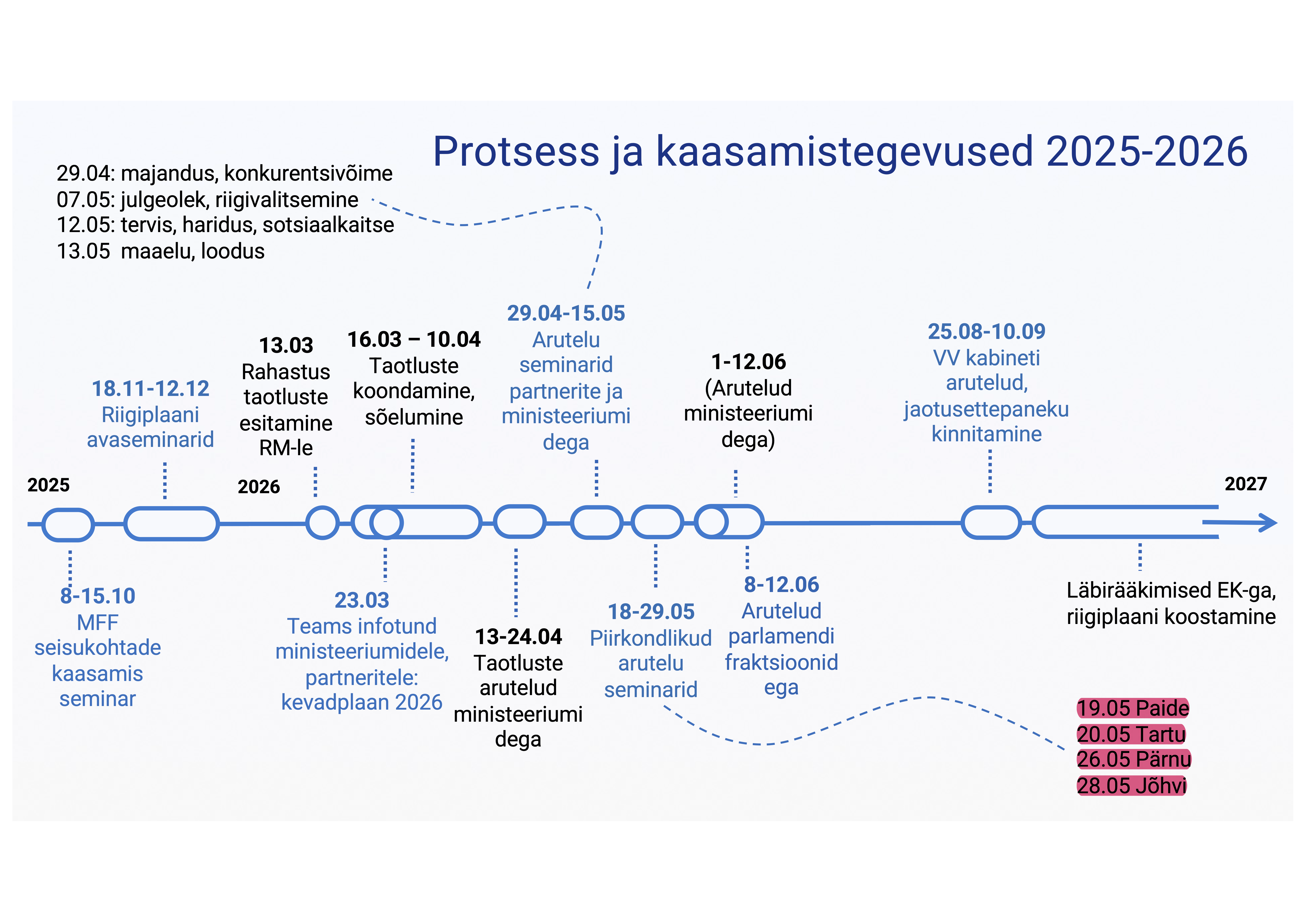 2025. aasta sügisel alanud kaasamisprotsess, kus oleme LEADER tegevusrühmade esindajatena algusest peale osalenud, jõudis vahefinišini märtsi algul, mil kõik ministeeriumid esitasid oma ettepanekud konkreetsete rahastustaotlustena. Nende dokumentide kokkuvõttega saab tutvuda riigiplaani lehel alates 10. aprillist. Esimene ülevaade anti 23. märtsi infotunnis – infotunni slaidid leiate siit.
